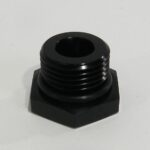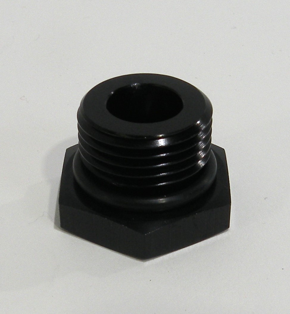 Aluminum fuel fitting hex head plug with 7/8-14 straight threads. O-ring seal included. Black anodize finish.