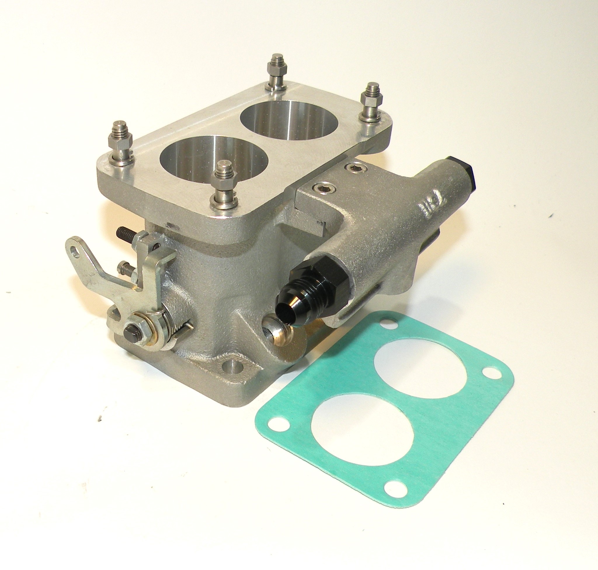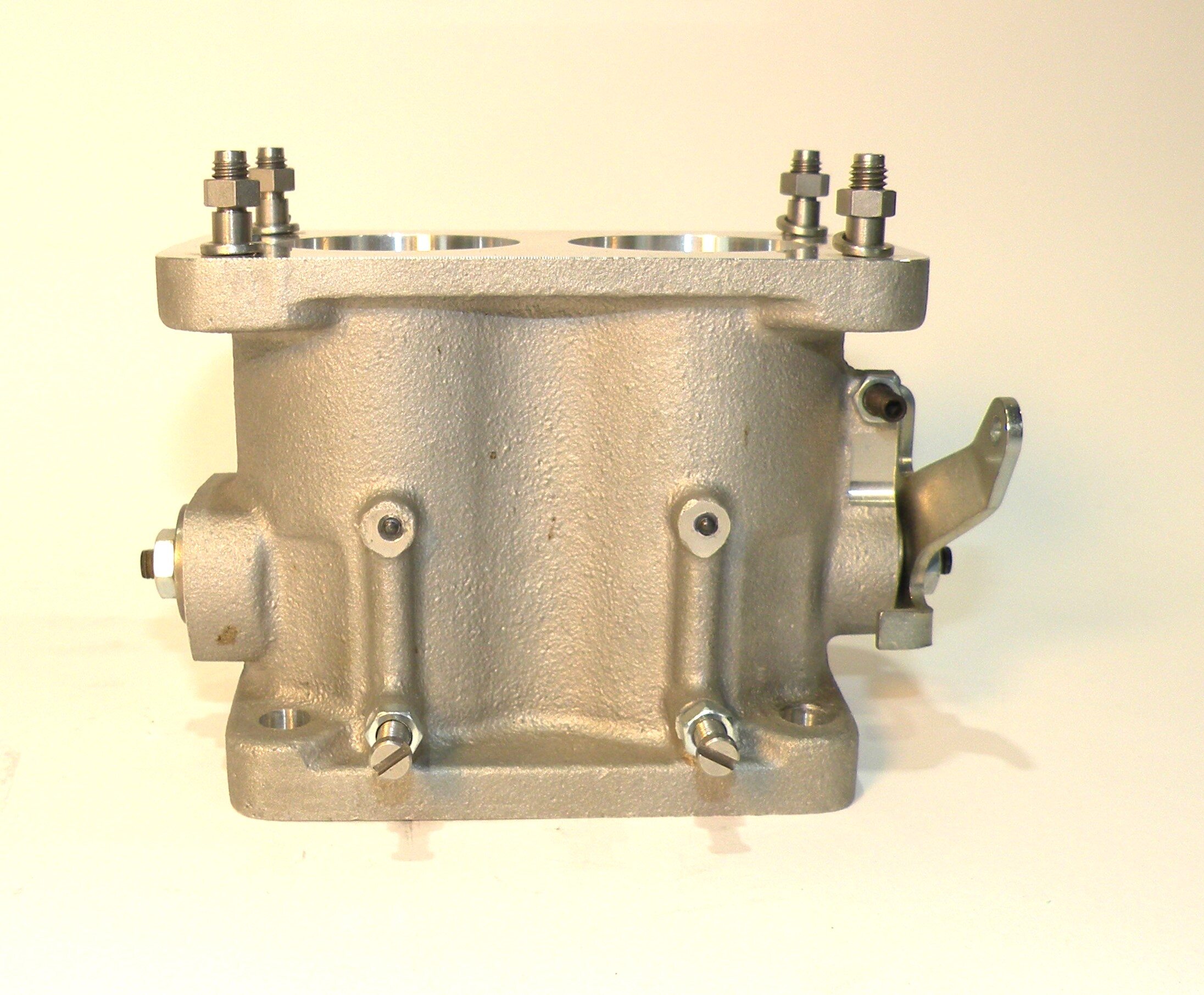 This Borla Induction throttle series is a direct replacement for the DCNF carburetors fitted to Ferrari, Maserati, and Aston Martin, in addition to having a number of aftermarket applications. The unit is extremely compact with barrel centers at 48mm and an overall height of 86mm. The manifold mounting and air cleaner flanges are identical to the DCNF carburetor. Each barrel has an air by-pass screw. The fuel rail has integral mounts and AN-6 threads, and is supplied with the unit. The rail and throttle accept a Bosch type EV14 standard length injector. The left hand unit incorporates a shaft with a single 5/16″ D-drive and mounting pad for throttle position sensor part number 206288. Several alternate shaft linkage levers are available for series or parallel applications.