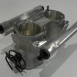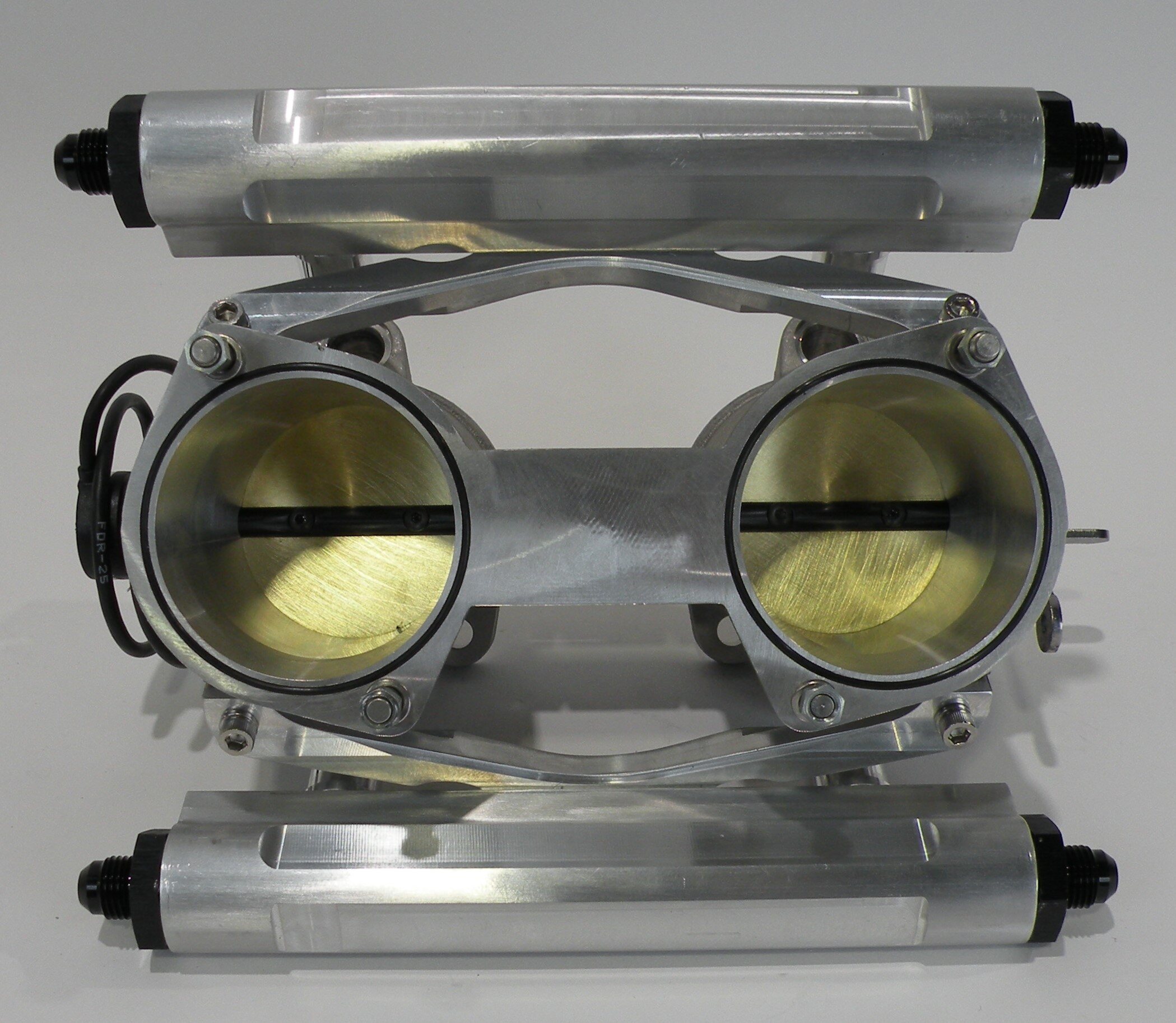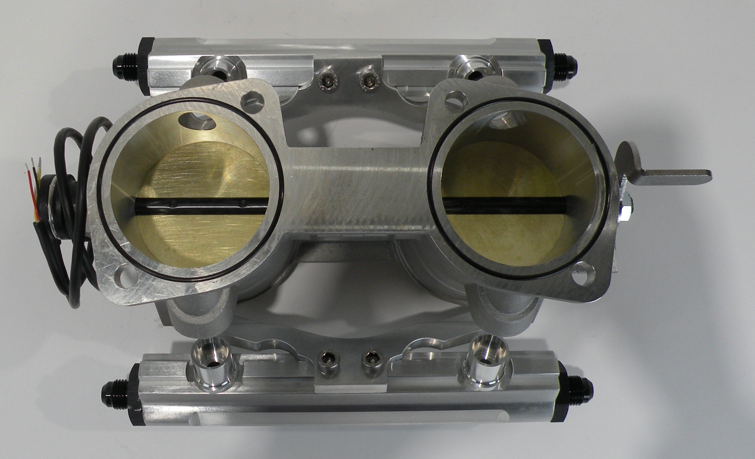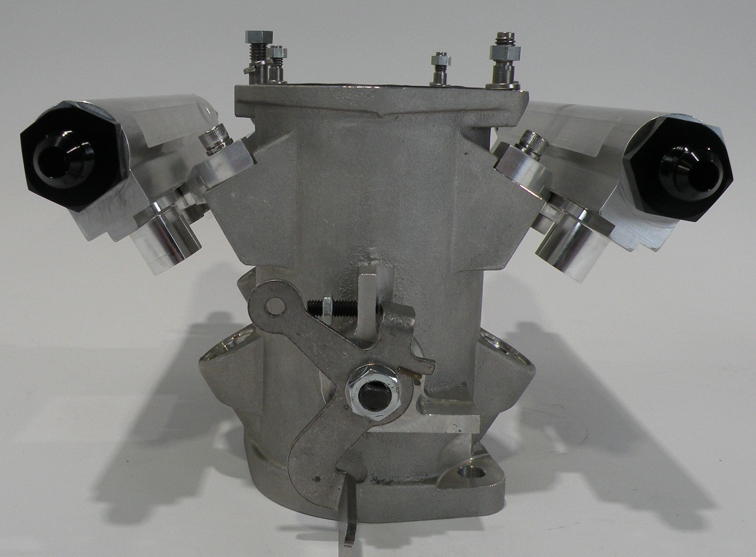 These are large bore throttles with an IDA mounting pattern, suitable for use on rotary engines. They are available in sizes 56mm, 58mm and 62mm. Configured for injectors on both sides, two high volume AN-10 fuel rails and a Hall effect throttle position sensor (TPS) are included. Please specify if you will use EV1 or EV14 type injectors so suitable fuel rails will be installed. All three sizes of throttles can be fitted with optional 201087 air horns since the top of the throttle is bored to 62mm.