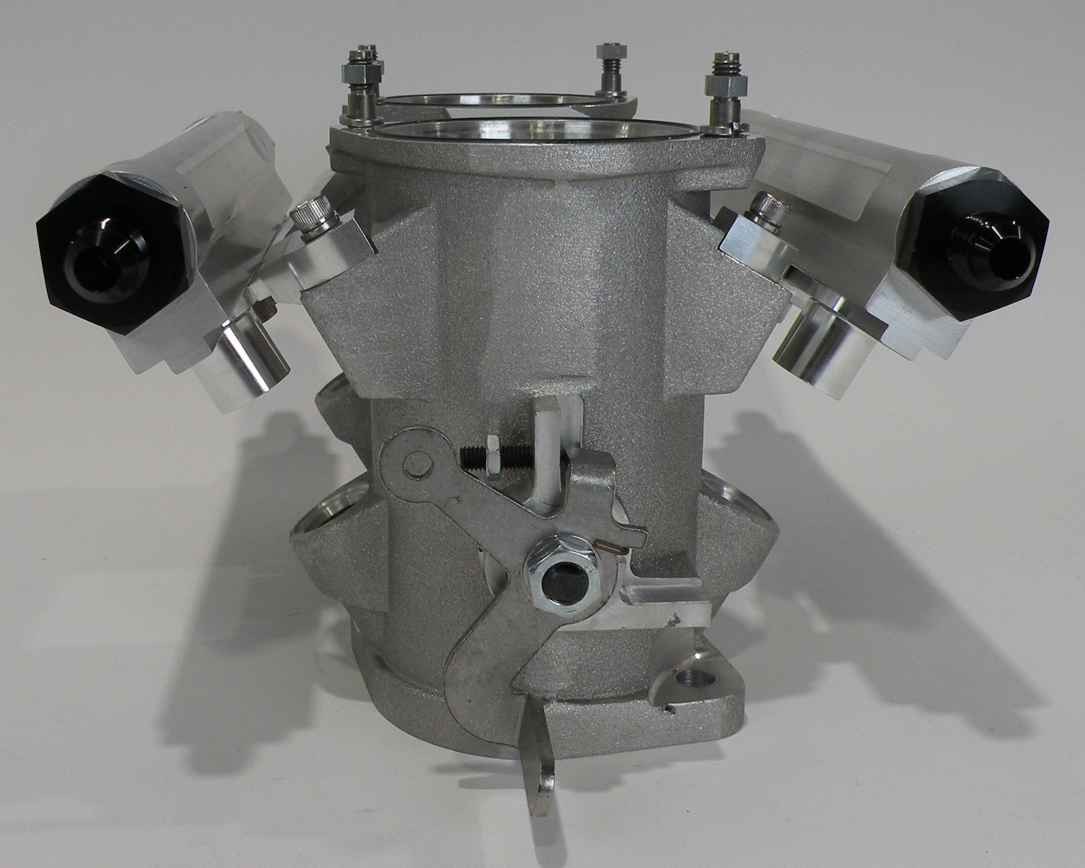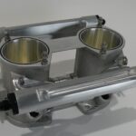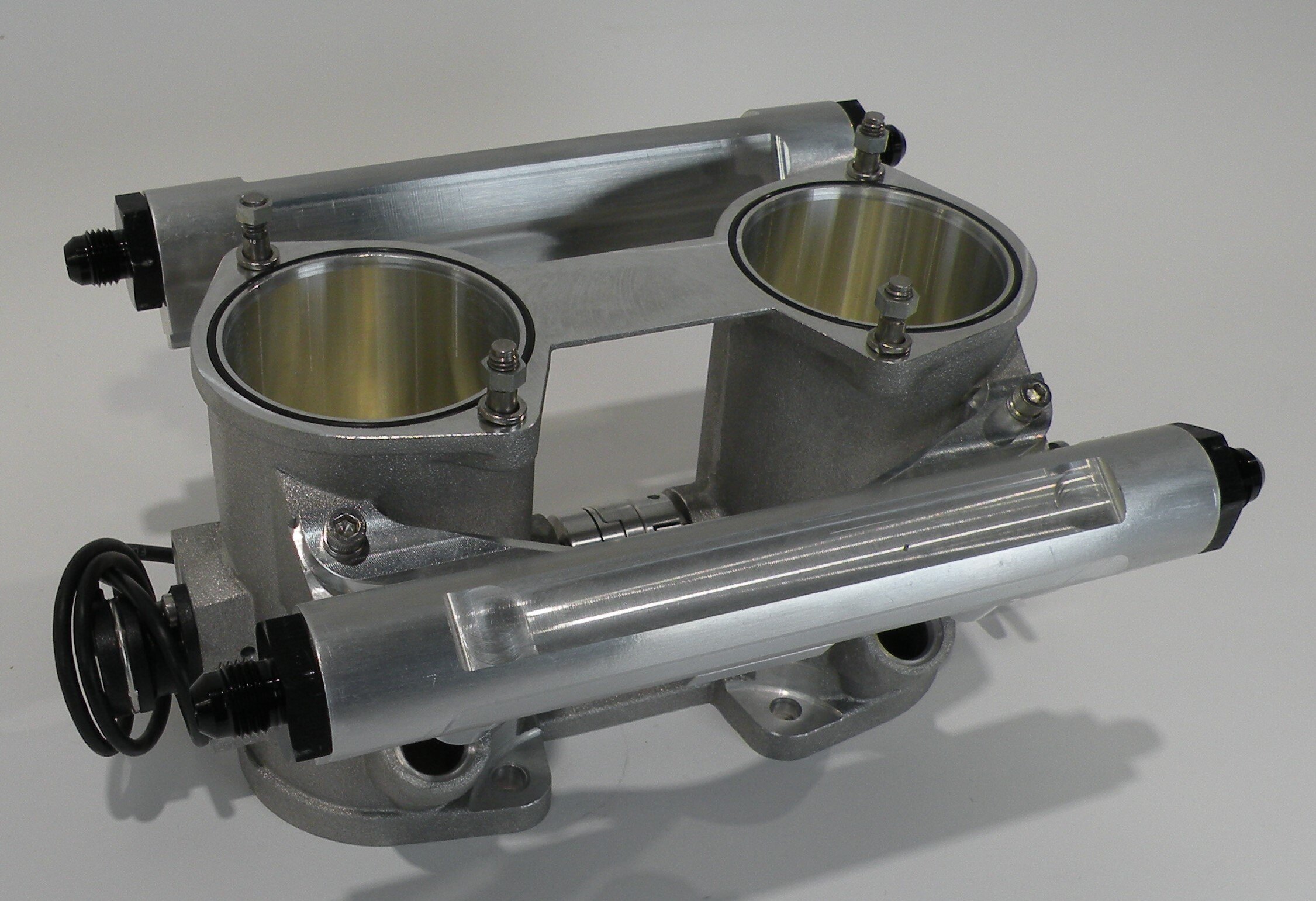 These are large bore throttles with an IDA mounting pattern, suitable for use on rotary engines. They are available in sizes 56mm, 58mm and 62mm. Configured for injectors on both sides, two high volume AN-10 fuel rails and a Hall effect throttle position sensor (TPS) are included. Please specify if you will use EV1 or EV14 type injectors so suitable fuel rails will be installed. All three sizes of throttles can be fitted with optional 201087 air horns since the top of the throttle is bored to 62mm.