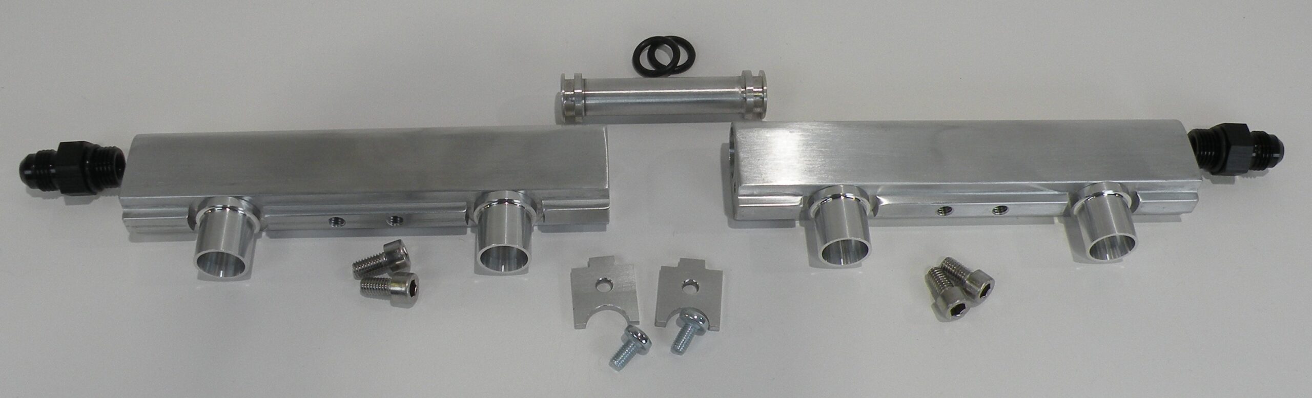 Natural finish aluminum fuel rails for mounting to Borla DCOE or IDF throttles. For port spacing between 100 and 124mm and EV14 style injectors (52.2mm between injector O-rings). Includes -6AN fittings, joining tubes and mounting hardware.