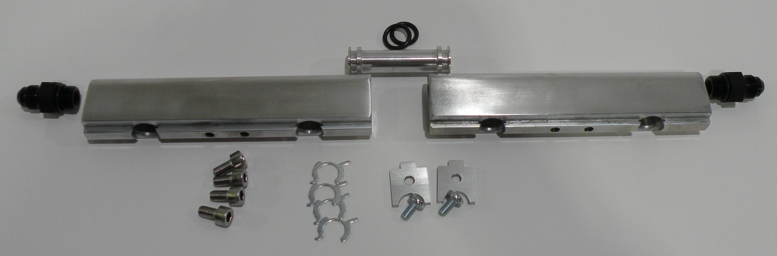 Natural finish aluminum fuel rails for mounting to Borla DCOE or IDF throttles. For port spacing between 83 and 105mm and EV1 style injectors (58.7mm between injector O-rings). Includes -6 AN fittings, joining tubes and mounting hardware.