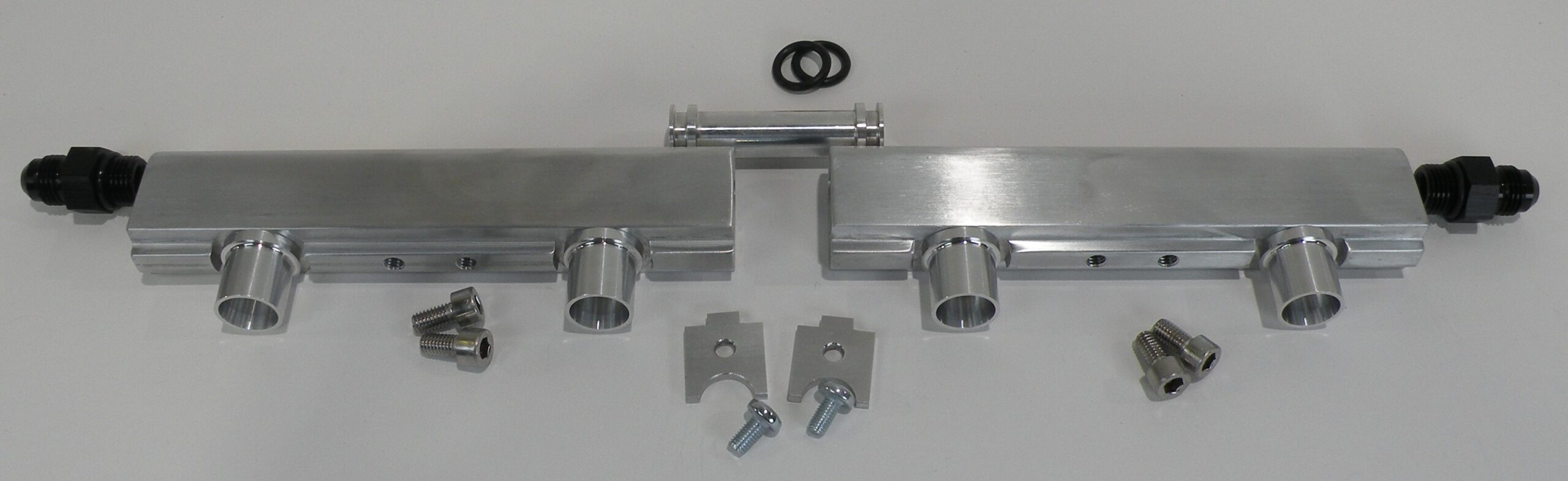 Natural finish aluminum fuel rails for mounting to Borla DCOE or IDF throttles. For port spacing between 83 and 105mm and EV14 style injectors (52.2mm between injector O-rings). Includes -6 AN fittings, joining tubes and mounting hardware.