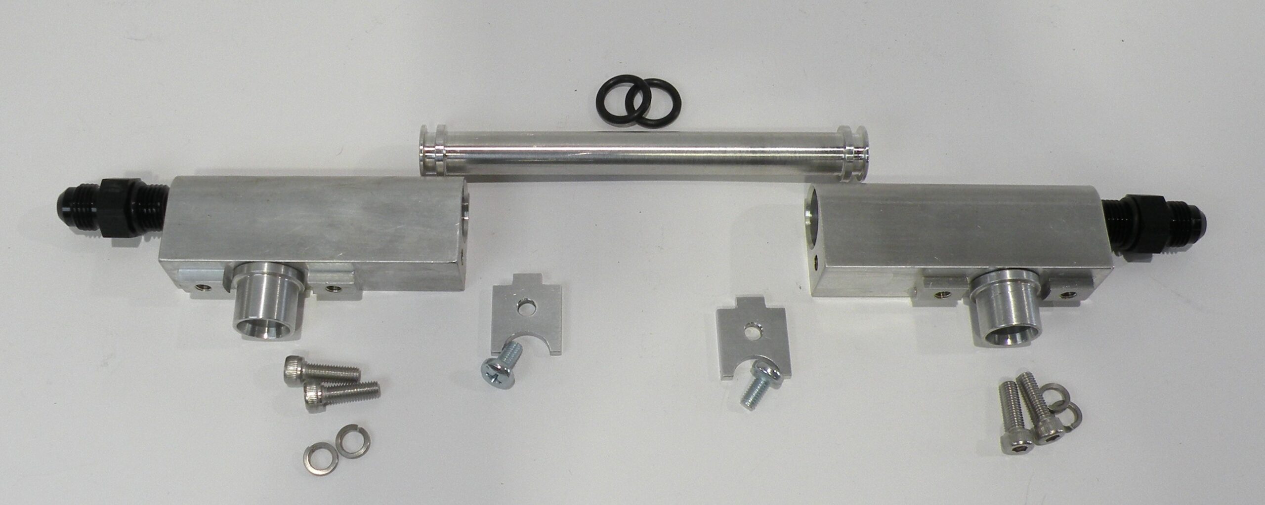 Natural finish aluminum fuel rails for mounting to Borla SU throttles. For use with EV14 style injectors (52.2mm between injector O-rings). Includes -6 AN fittings, joining tube and mounting hardware.