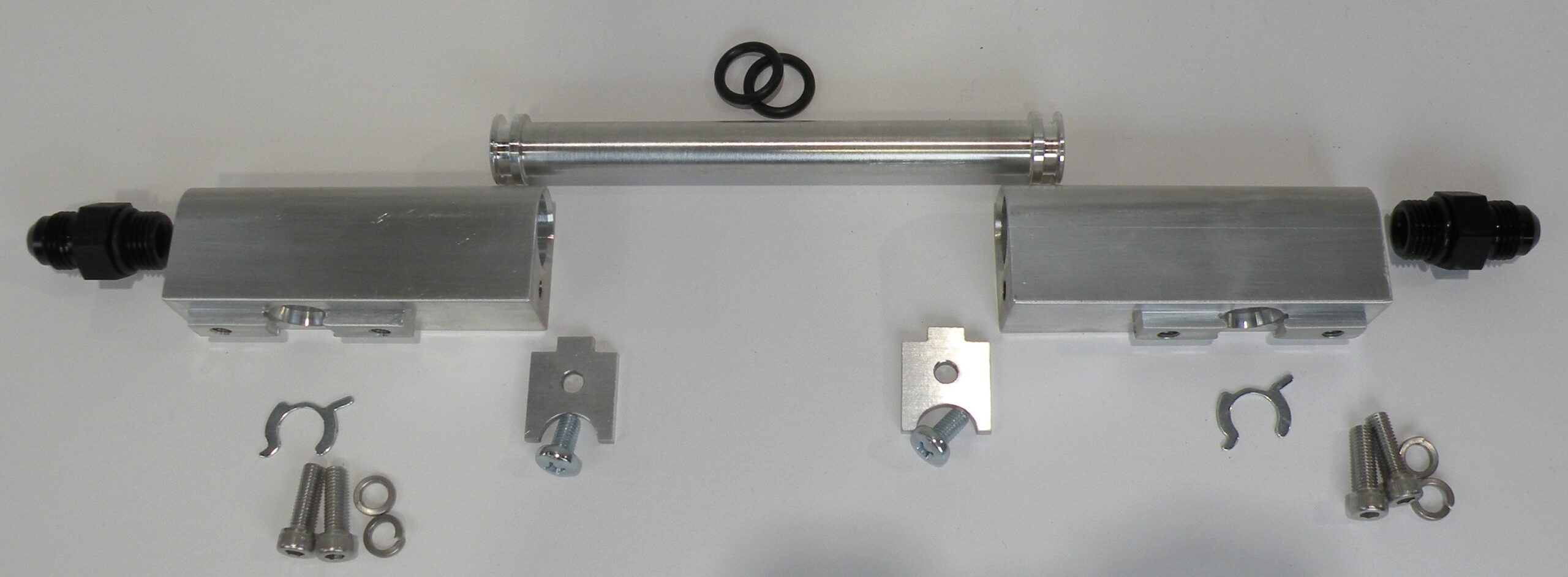 Natural finish aluminum fuel rails for mounting to Borla SU throttles. For use with EV1 style injectors (58.7mm between injector O-rings). Includes -6 AN fittings, joining tube, injector clips and mounting hardware.