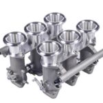 Direct throttle body replacements for downdraft IDA 3C carburetors as fitted to early Porsche 911, Ferrari 512 and Lamborghini models, available with 40mm, 44mm and 46mm bores. The barrel centers are at 94mm and the overall height is 123.5mm. The manifold mounting flange is identical to the flange on the Weber IDA 3C. The air filter flange differs from the carburetor in that it uses 6mm studs which are 1mm further apart than the carburetor. Each barrel has an air by-pass screw. MAP sensor ports are provided on both units. There are integral mounts for the fuel rails which are supplied with the unit, as are AN-6 flare fittings. The TPS unit incorporates a shaft with a single 5/16 ” D-drive and mounting pad for adding Borla Induction 206288 throttle position sensor. Air horns 50mm tall are included, with optional 35mm, 75mm and 100mm heights available.