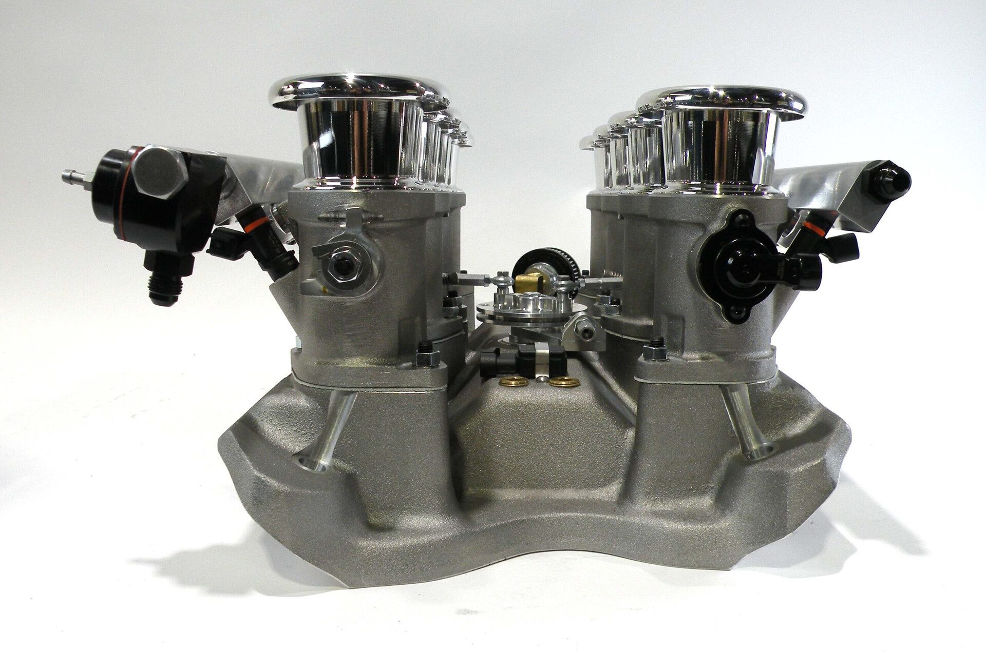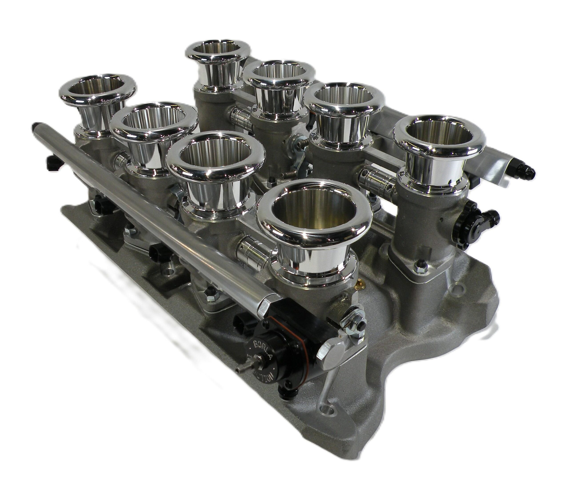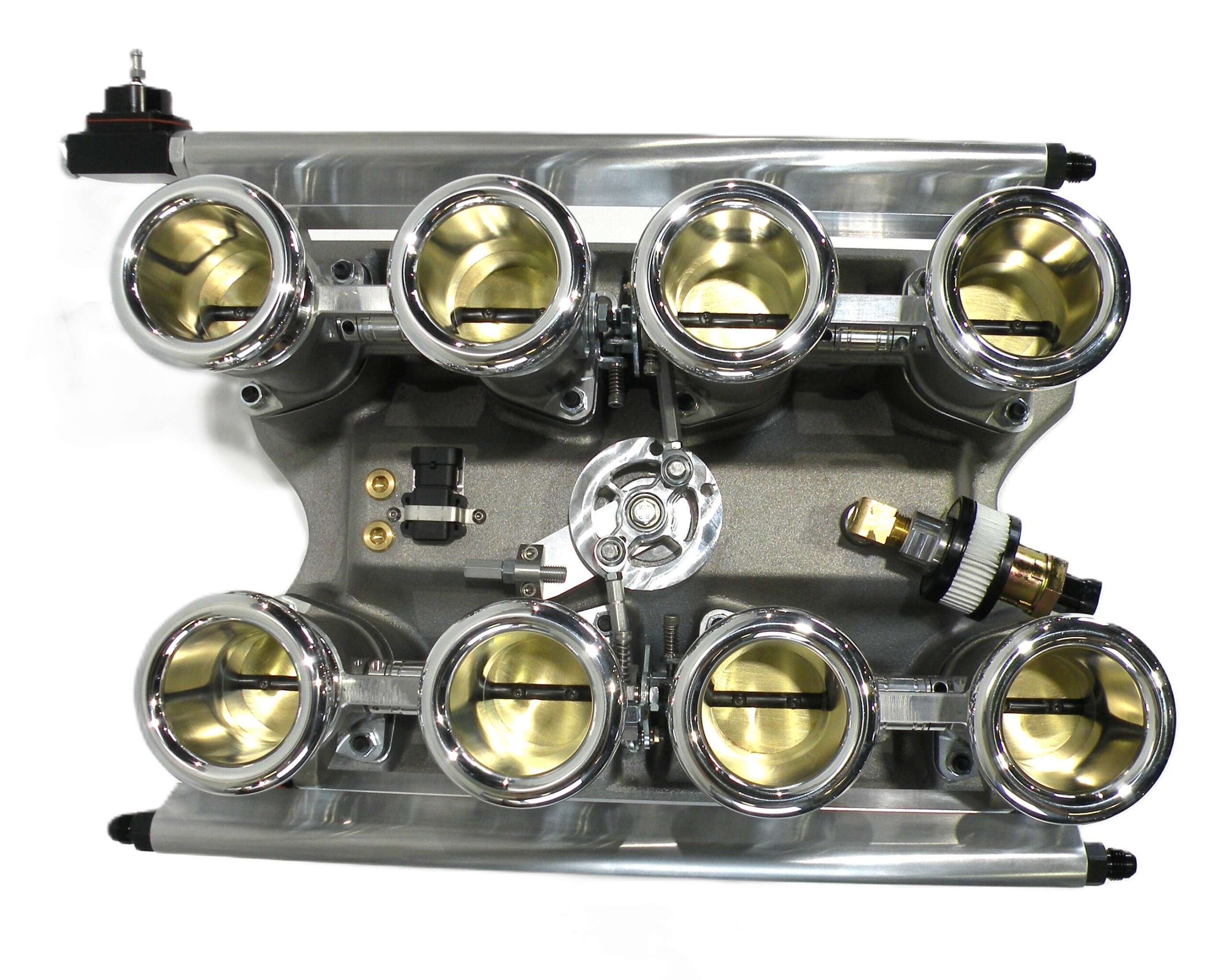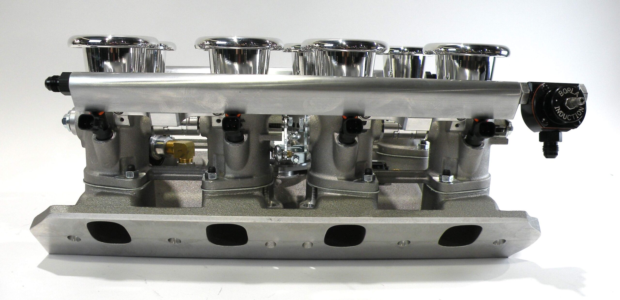Now available for the Cleveland engine, our unique Borla 50mm throttle bodies and a cast aluminum manifold form the basis for an individual runner system that harkens back to the old mechanical fuel injection of early drag racing lore. The common plenum design provides for integrated MAP sensor, idle air control and PCV accommodation. Also included is the throttle position sensor, fuel rails with integrated fuel pressure regulator and our reputable precision calibrated linkage. These throttles have the option for different length airhorns ranging from 35 to 100mm to accommodate challenging under hood clearances. Available in 2V,3V and 4V configurations.
