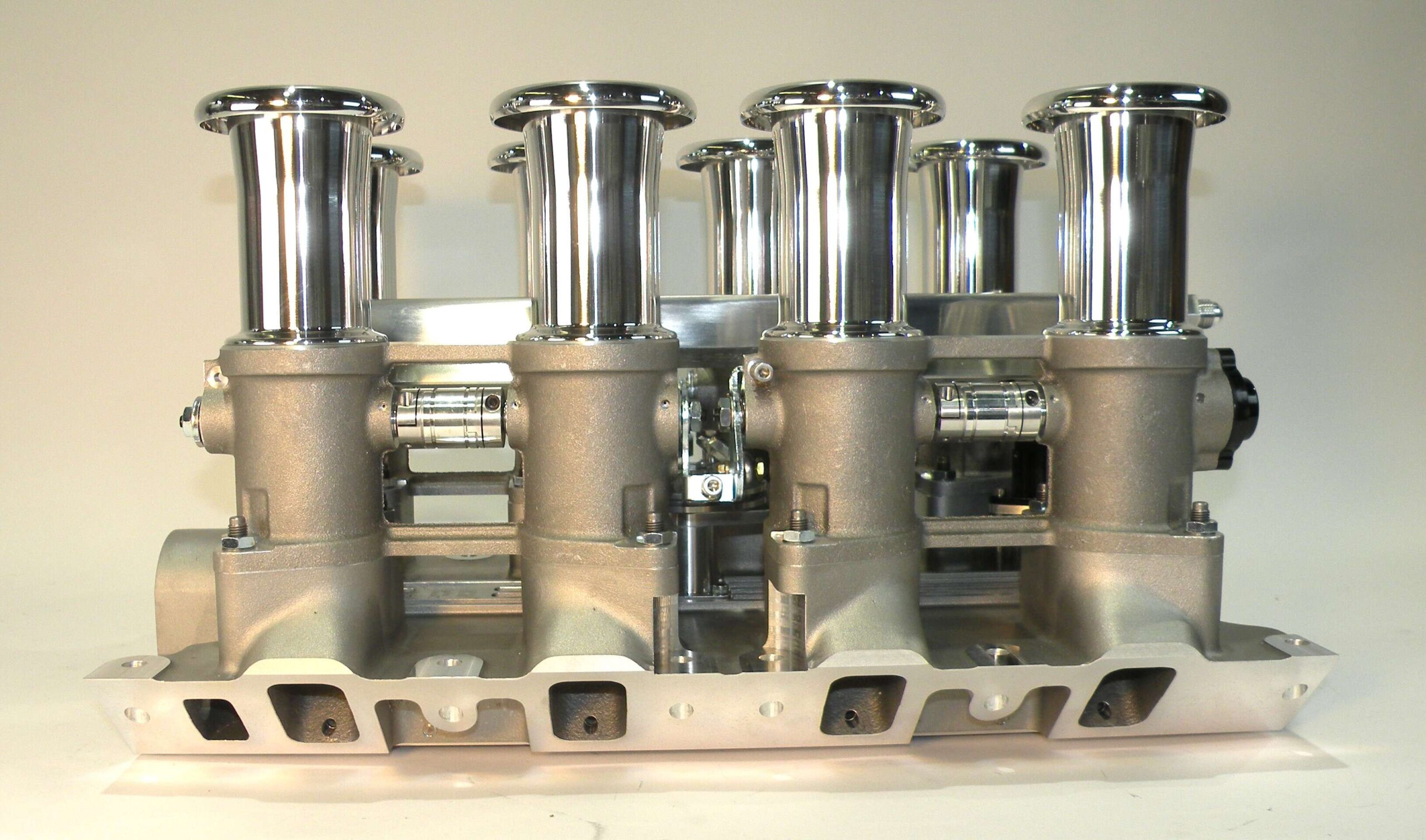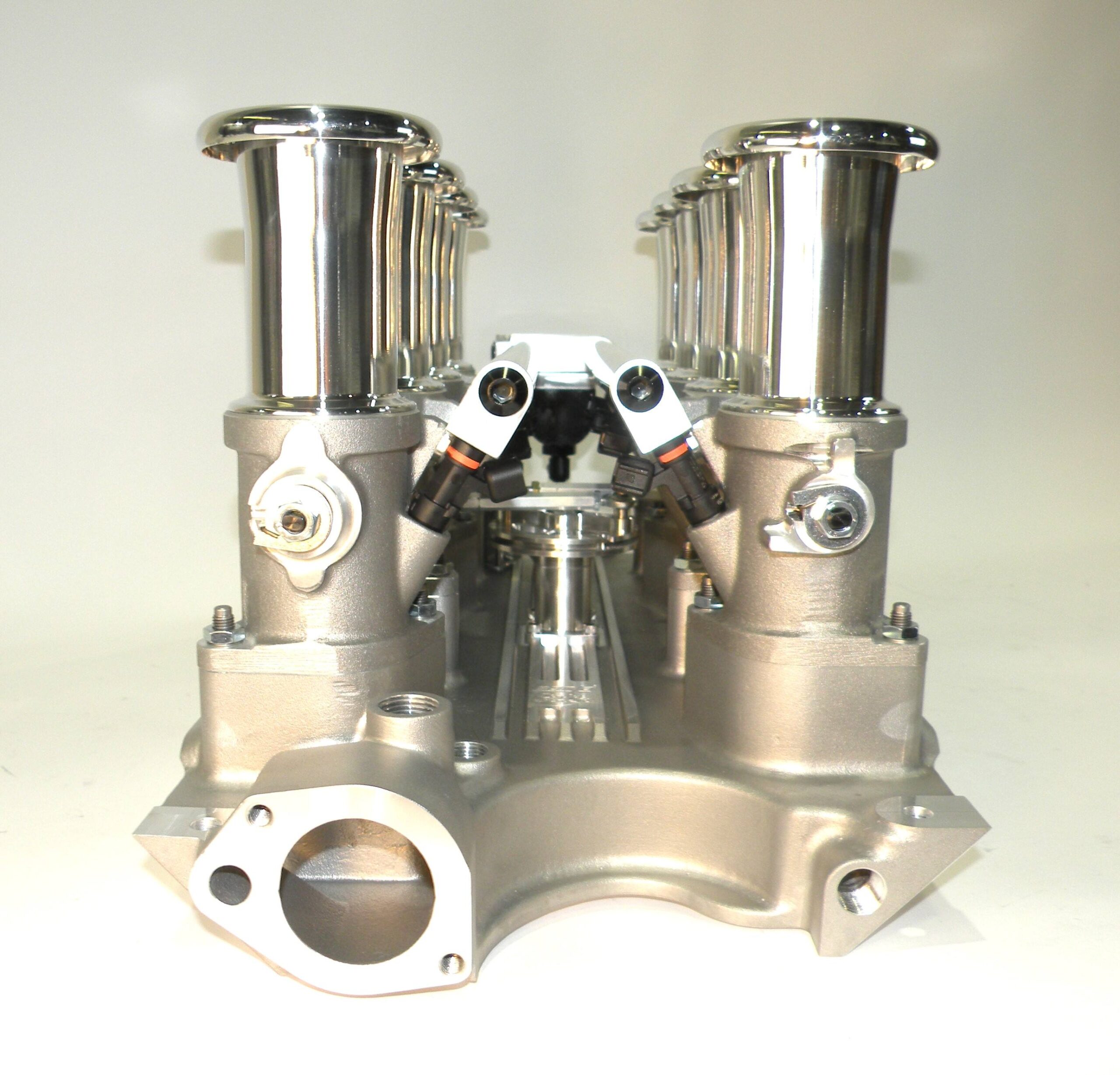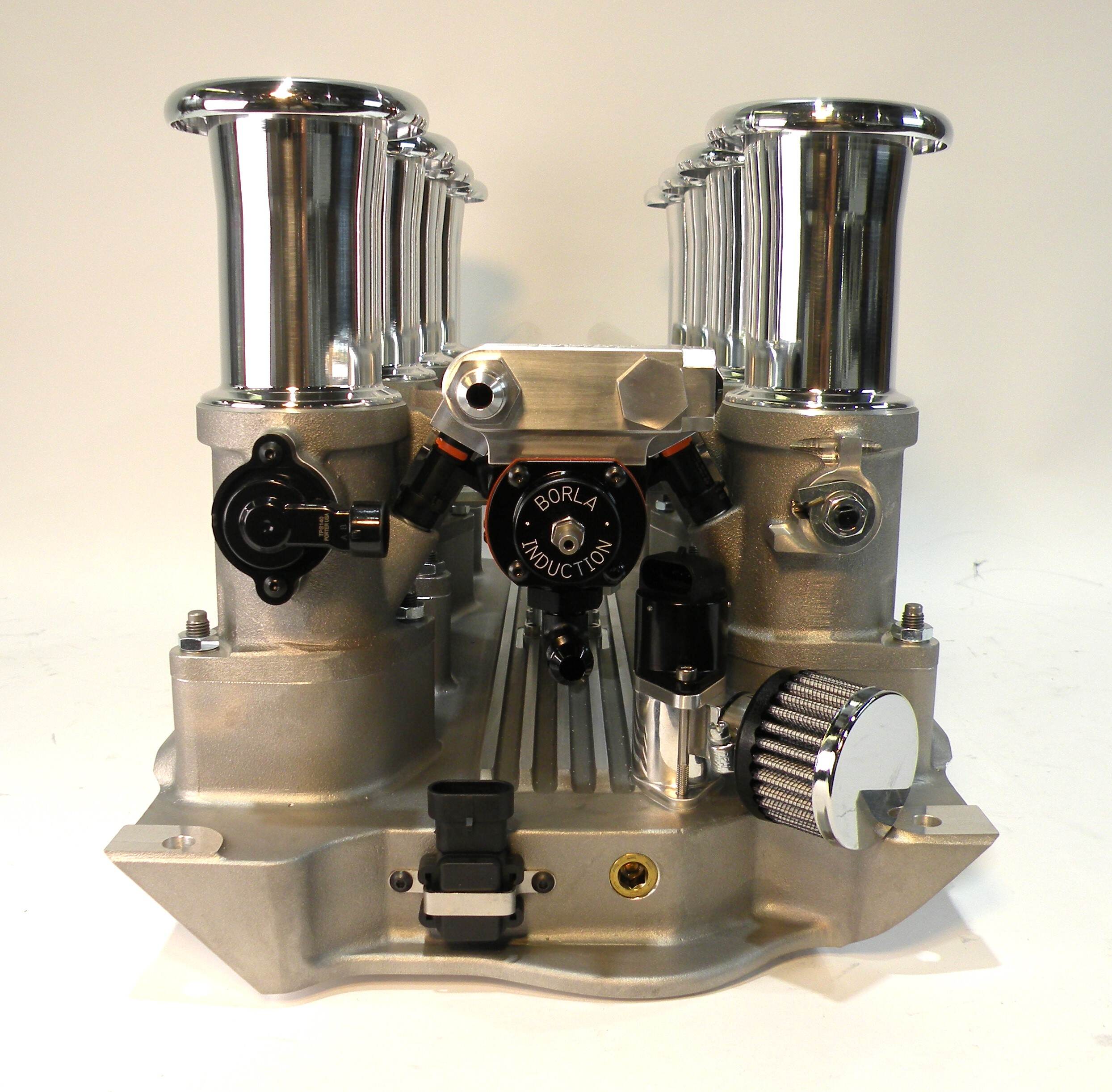 Specially designed for the 351W engine, this individual runner system harkens back to the old mechanical fuel injection of early drag racing lore. Our unique Borla 50mm throttle bodies on a cast aluminum common plenum manifold provides integrated MAP sensor, idle air control and PCV accommodation. Elegantly designed fuel rails have an integrated fuel pressure regulator and discreetly hidden electronic injectors. Our reputable precision calibrated linkage components combined with modern electronics, such as throttle position sensor and EV14 fuel injectors, lend the system to ease of tuning and drivability. These throttles have options for different length airhorns ranging from 35 to 100mm that will accommodate challenging under hood clearances. Special linkage which provides for TV cable attachment is available and should be requested when the throttle system is ordered. This is needed if an automatic transmission such as AOD will be used.