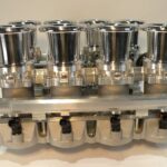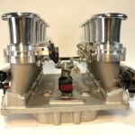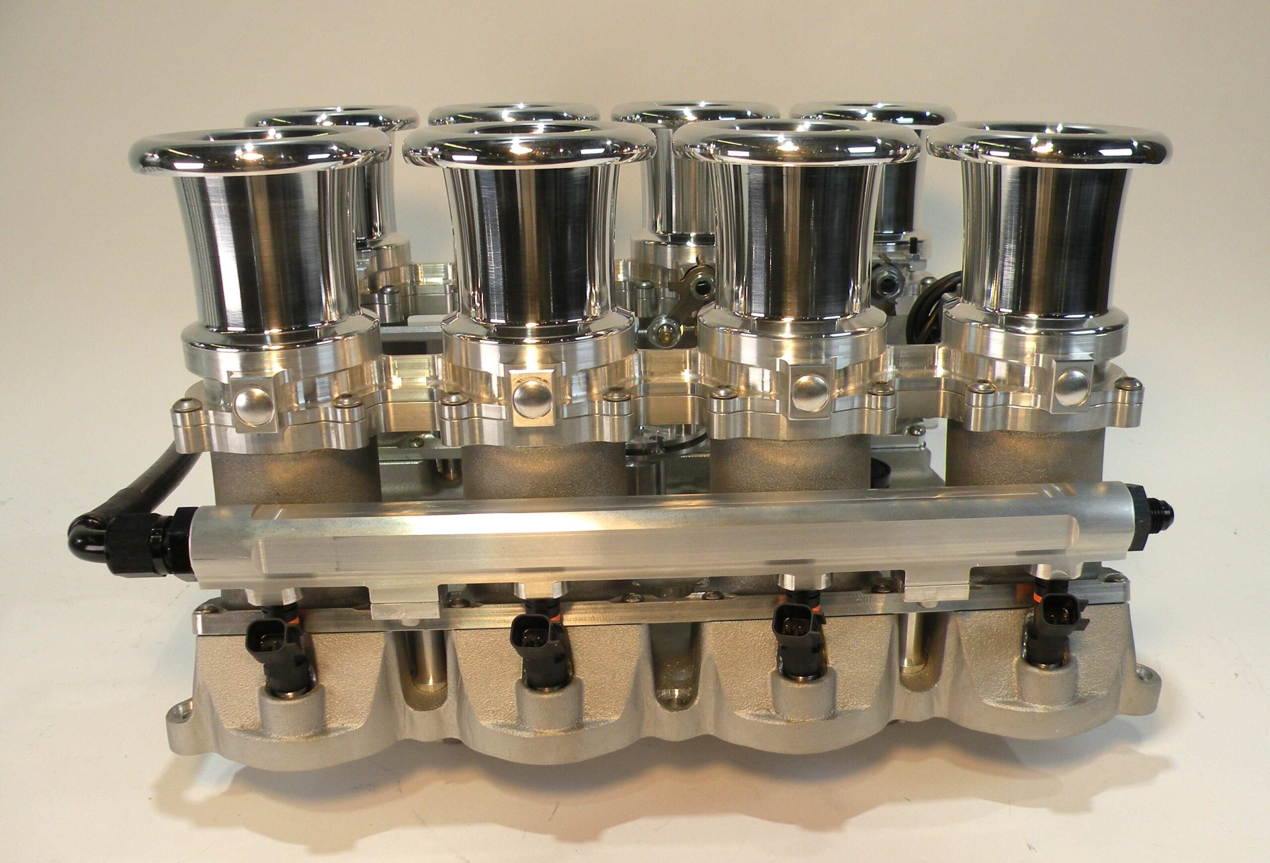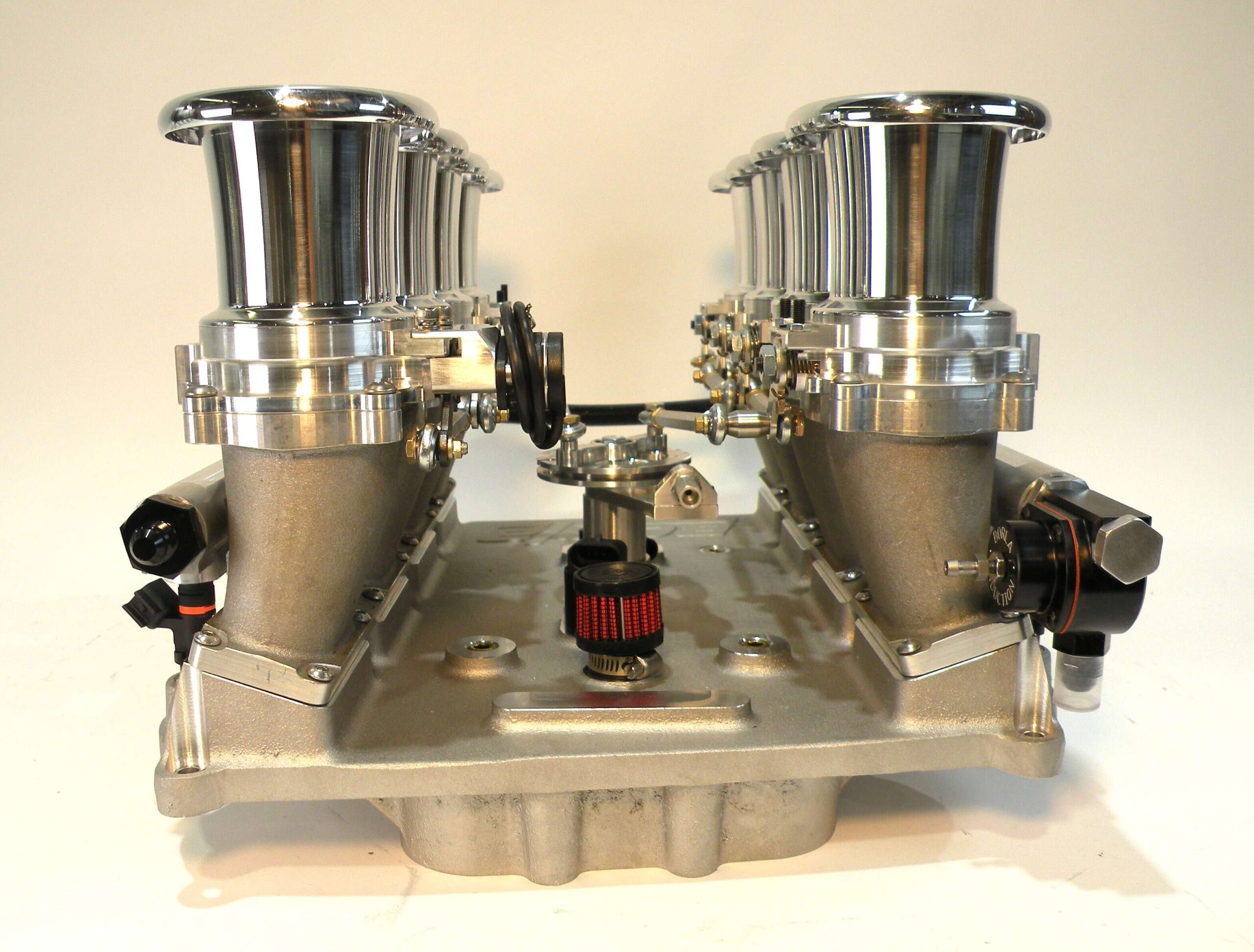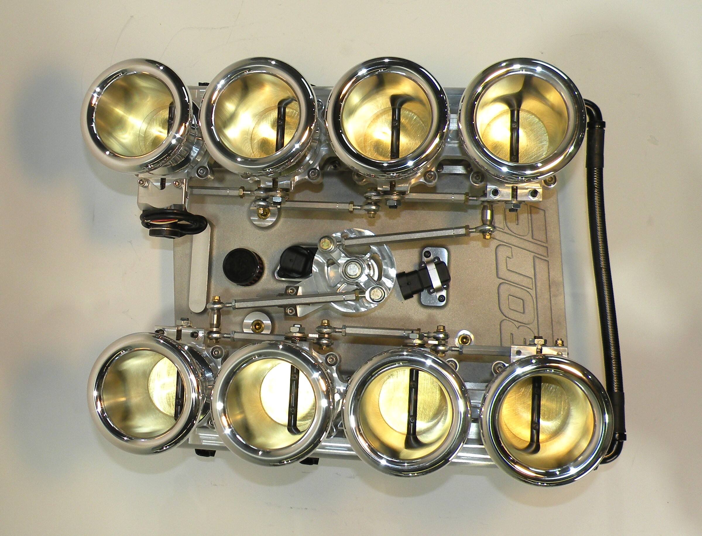 For the street-rod enthusiast who requires the look of vertical stacks, Borla brings you these throttles for the Ford Coyote engine. Featuring cast aluminum individual runners and manifold paired to our unique billet 55mm low-profile throttles, this offering has the most potential for performance & style of our lineup. The vertical design evokes hints of early road racing mechanical fuel injection while a common vacuum plenum eliminates all the hassles of multiple carburation. This unit is equipped with integrated Idle air control, MAP sensor, throttle position sensor, PCV accommodation, fuel pressure regulator and precision calibrated linkage components. High volume -10 fuel rails feed the included EV14 injectors. This system can be ordered with airhorn lengths ranging from 35 to 100mm to accommodate challenging under hood clearance. With style and performance unmatched, this is the choice for those wanting the ultimate piece of EFI jewelry.