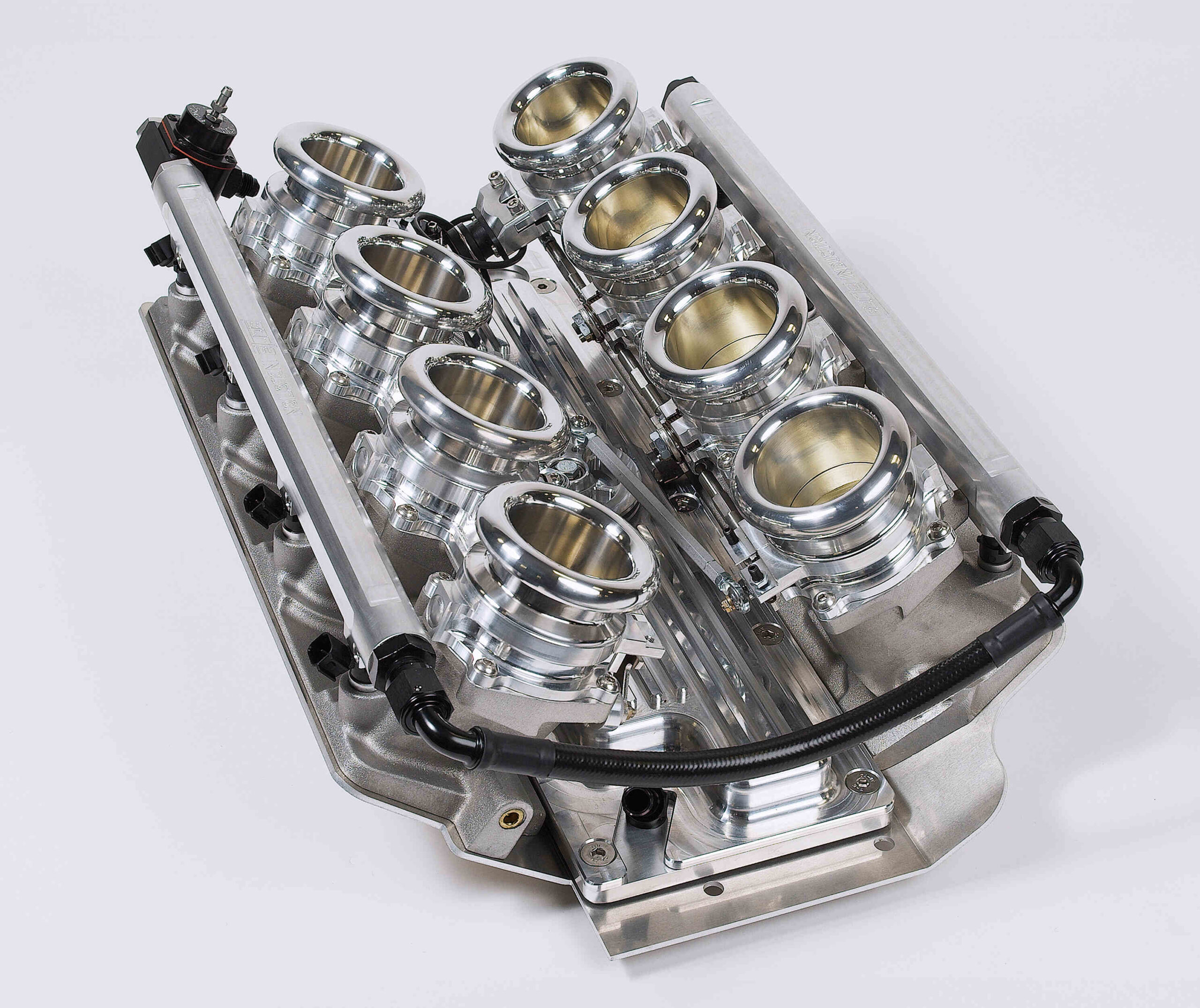 Featuring cast aluminum individual rectangular port runners paired to our unique billet 55mm low-profile throttles, this offering has the most potential for performance & style of our lineup. The canted design evokes hints of early road racing mechanical fuel injection while a common vacuum plenum eliminates all the hassles of multiple carburation. Also adding ease of use is the integrated idle air control, MAP sensor, throttle position sensor, PCV accommodation and precision calibrated linkage components. Engineered for hood clearance similar to a stock manifold, with style and performance unmatched, this is the choice for those wanting the ultimate piece of EFI jewelry.
