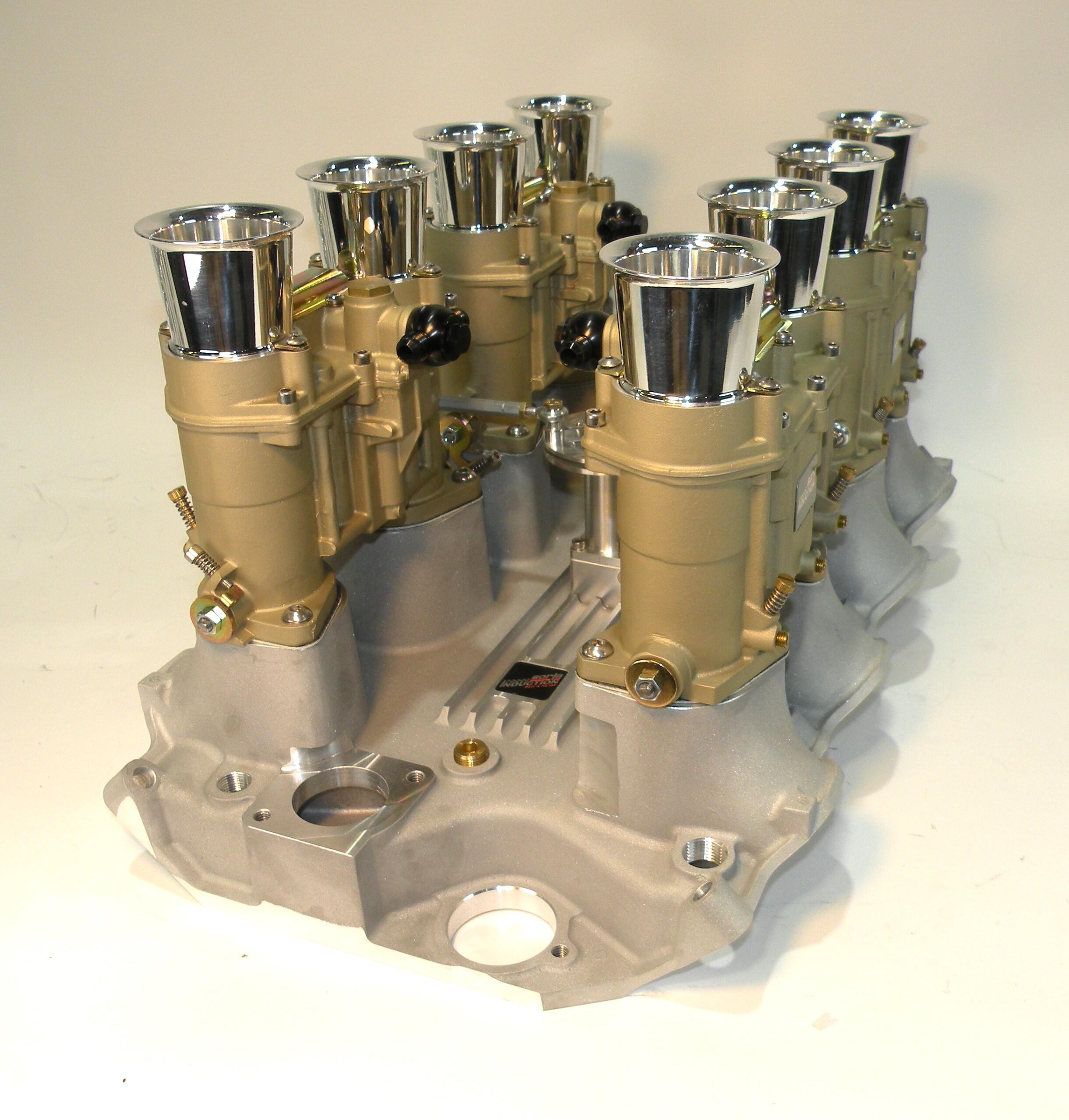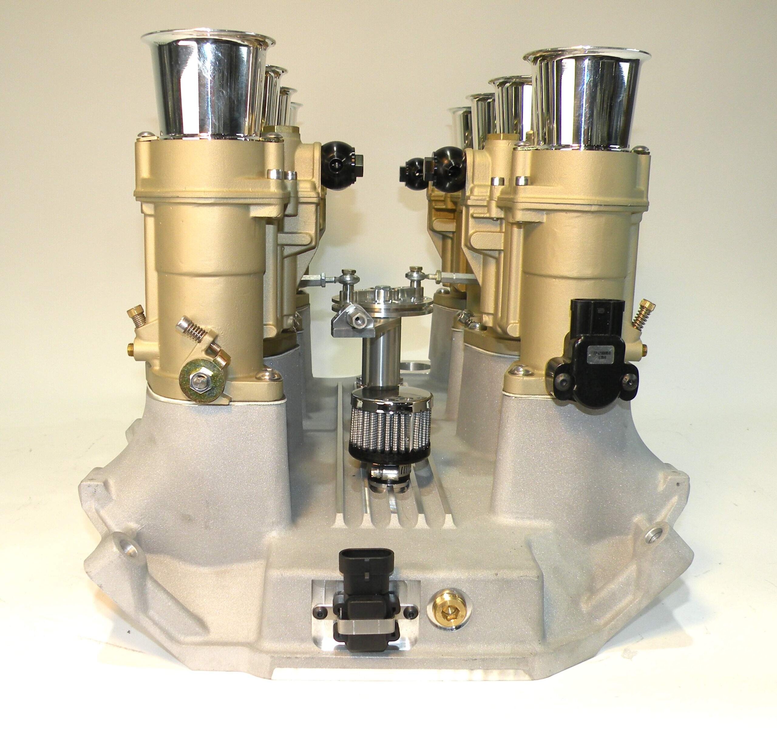 These Borla throttle body systems are fuel injection platforms pairing a retro “Weber look” of the 60’s & 70’s with modern performance and reliability. In fact, most well-seasoned aficionados have difficulty discerning our product from actual vintage carburation. They offer the classic WOW-factor while eliminating the hassles of multiple carburation through the use of a common plenum manifold that integrates Idle air control, PCV accommodation and MAP sensor. Modern fuel injectors are concealed within the throttles which also include a throttle position sensor and are actuated via precision calibrated linkage. Half height (25mm) airhorns are available on request to reduce vertical clearance.